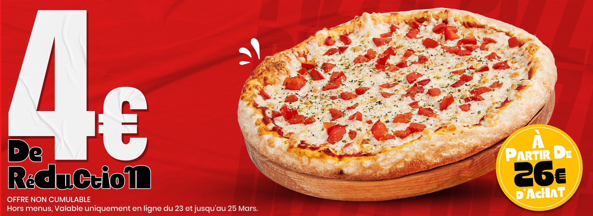 *La réduction s'applique sur la pizza la moins chère. Uniquement sur les commandes en ligne.
