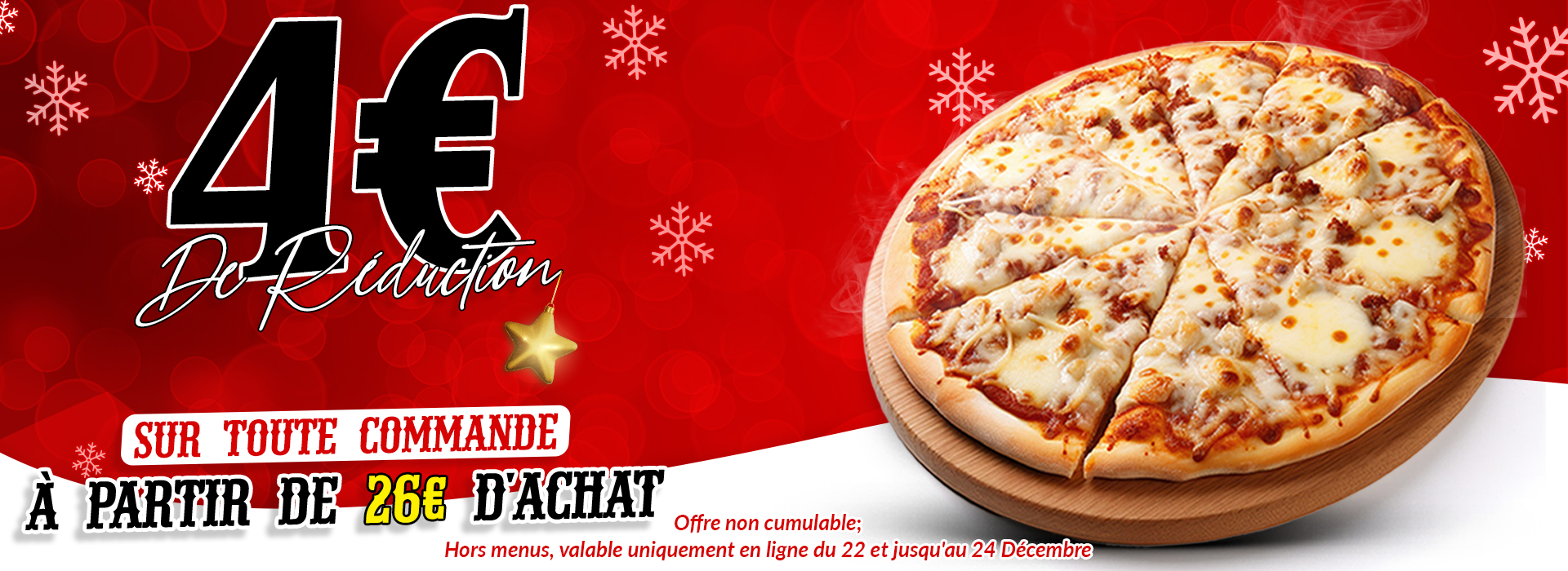 *La réduction s'applique sur la pizza la moins chère. Uniquement sur les commandes en ligne.