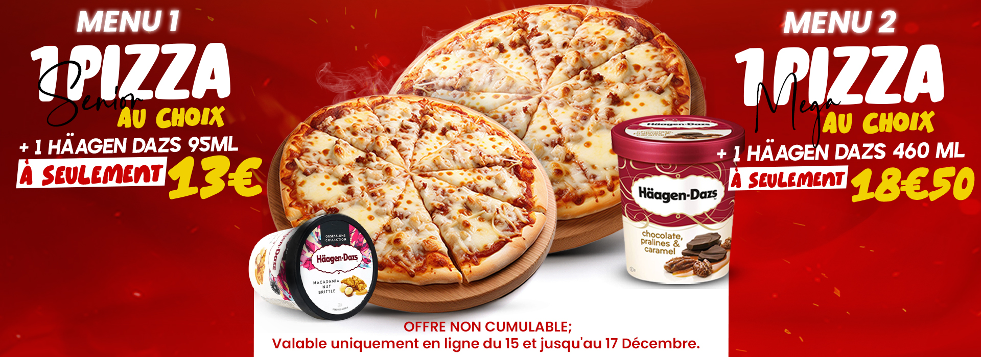 *La réduction s'applique sur la pizza la moins chère. Uniquement sur les commandes en ligne.