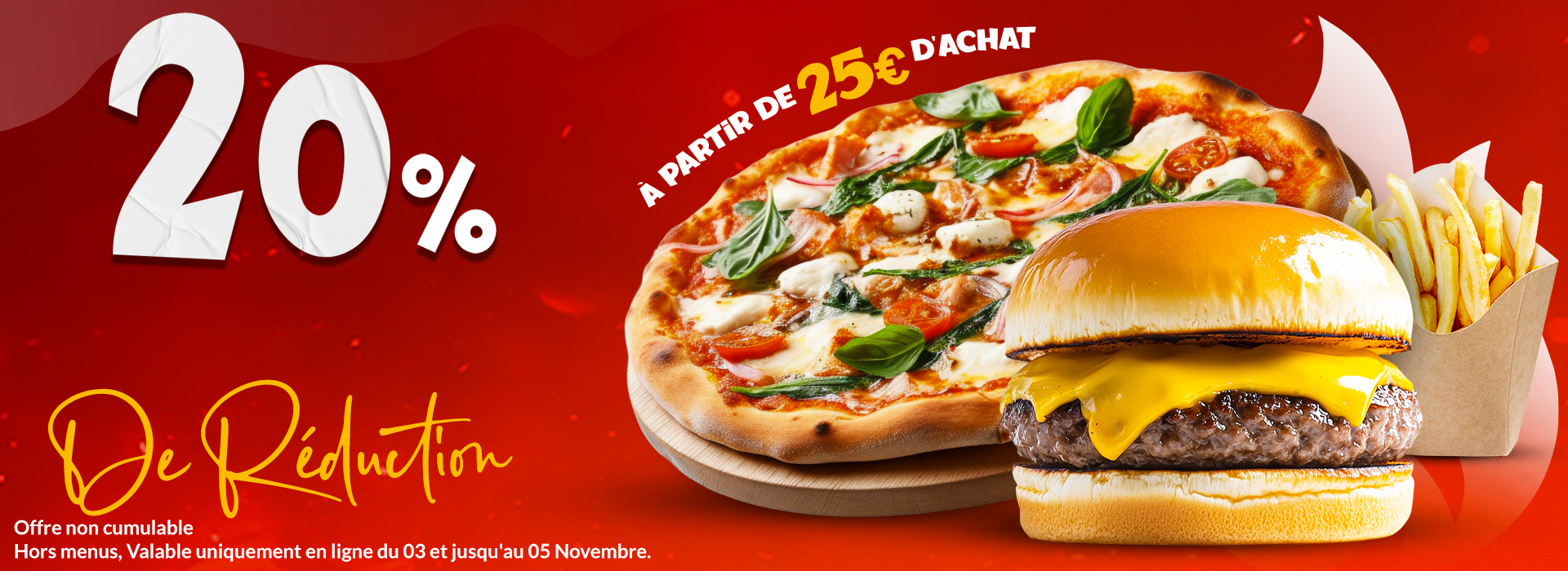 *La réduction s'applique sur la pizza la moins chère. Uniquement sur les commandes en ligne.