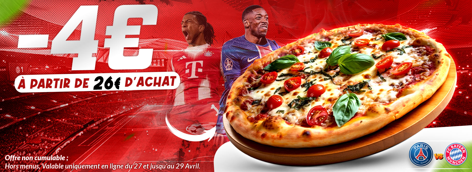 *La réduction s'applique sur la pizza la moins chère. Uniquement sur les commandes en ligne.