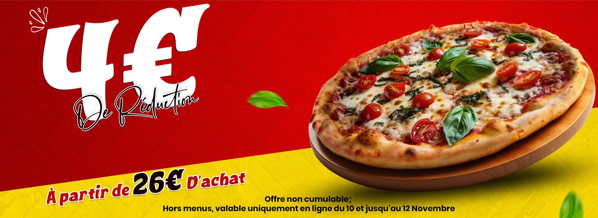 *La réduction s'applique sur la pizza la moins chère. Uniquement sur les commandes en ligne.